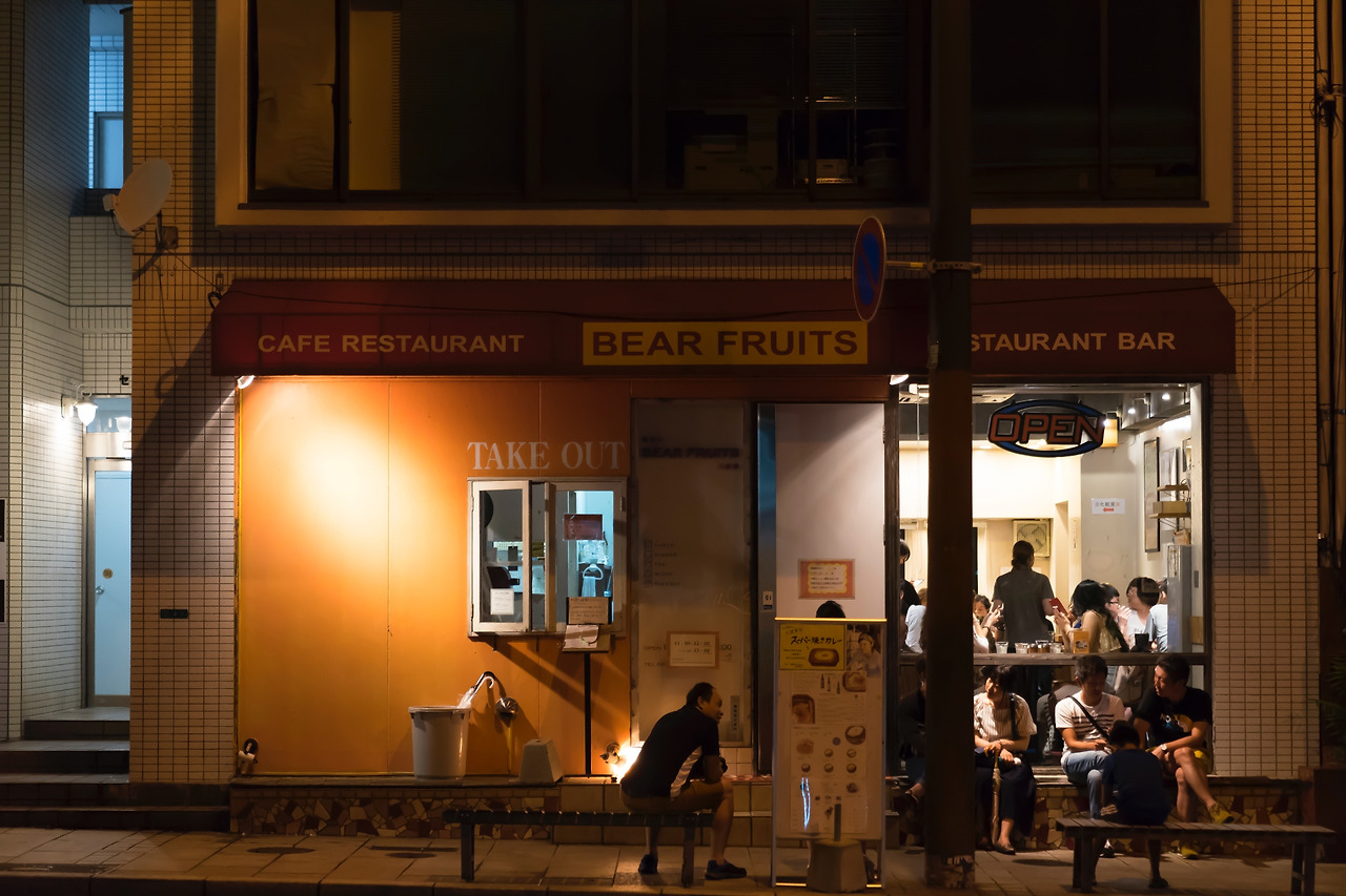 문이 열리기도 전부터 대기 손님들이 기다리고 있을 정도로 인기 있는 야키 카레 전문점, 베어 프루츠. 메뉴는 단출한 편이다. 카레의 종류는 두 가지로 슈퍼 야키 카레(スーパー焼きカレー, 850엔)와 쇠고기 슈퍼 야키 카레(ビーフ入りスーパー 焼きカレー, 1,050엔)로 나뉜다. 소고기 슈퍼 야키 카레는 하루에 한정된 수량만 제공되고 원하는 야키 카레 + 샐러드, 수프, 음료가 함께 제공되는 세트 메뉴로 주문할 수도 있다.