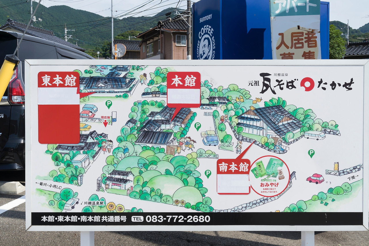 기왓장 위에 소바를 구워 먹는다는 발상 자체가 독특해 '어떤 음식일까' 호기심에 가게를 찾는 손님들이 많다. 야마구치현을 대표하는 식당답게 가게 앞에는 넓은 주차장이 마련되어져 있고, 대형 버스 전용 주차장도 있다. 타카세 본관 옆에는 남본관, 동본관이 차례로 위치해 있고, 각 본관마다 영업시간이 다르므로 방문하는 날에 문을 여는 본관을 알고 있어야 한다.