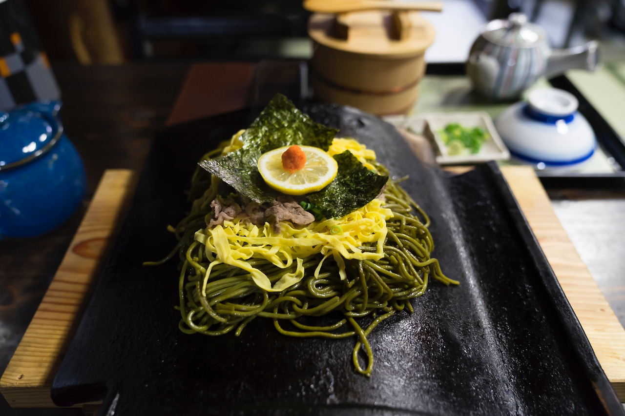 초록색 면 위에는 노란색 계란 지단과 양념된 고기가 올라가고 김, 레몬이 그 위를 덮고 있다. 살짝 구워진 소바는 가다랑어와 다시마로 우려낸 달짝지근하면서 짭조름한 소스에 면과 고기, 지단을 찍어 먹으면 된다. 기왓장에 살짝 구웠기 때문에 바삭한 맛이 특징이다.