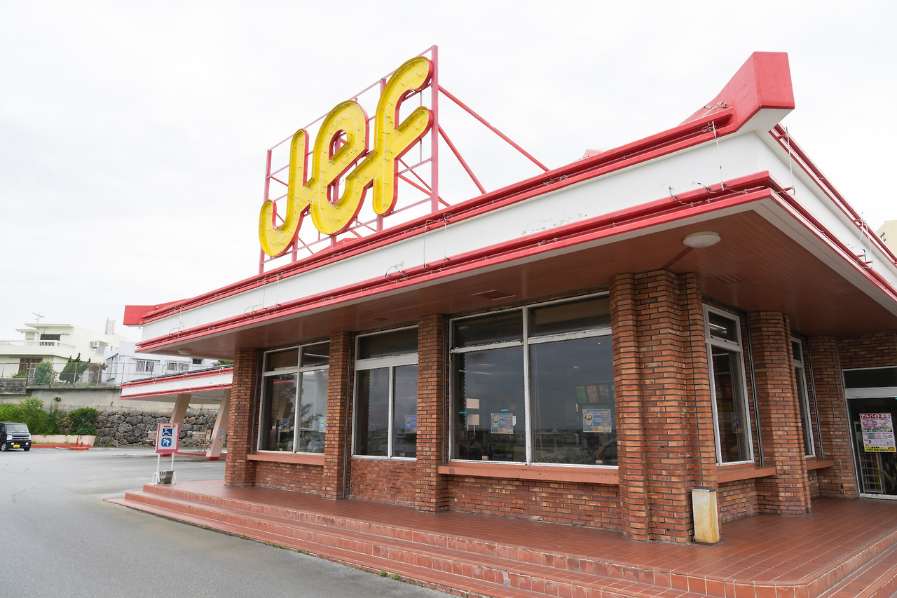 나하 공항에서 10분 정도 떨어진 곳에 24시간 영업하는 제프 도미구스쿠점(Jef 豊見城店)이 있다. 넓은 주차장을 비롯해 자동차에 앉아 호출 버튼을 눌러 주문하는 시스템도 가지고 있다. 1980년대에 문을 열었기 때문에 건물 자체는 조금 낡았지만, 오키나와 특유의 패스트푸드점 분위기를 느낄 수 있다.