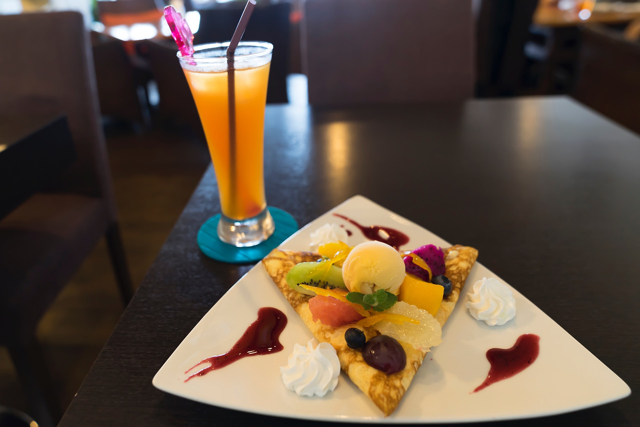 산토리니가 가장 붐비는 시간은 점심시간으로 닭고기, 돼지고기, 해산물로 만든 지중해 요리를 맛보기 위해 많은 손님들이 찾는다. 전채 요리, 메인 요리, 빵 또는 밥, 음료가 포함된 세트 메뉴를 선보이는데, 하마히가시마 런치(浜比嘉 ランチ, 1,600엔~)와 산토리니 런치 (サントリーニランチ, 2,100엔~)로 나뉜다. 각 런치 메뉴 내에서 어떤 메인 요리를 선택하느냐에 따라 가격이 달라지며, 메인 요리 종류는 구운 닭고기 요리, 오키나와산 돼지 등심 스테이크, 크림 사워 소스를 뿌린 해산물 요리로 나뉜다. 원하는 메인 요리와 음료 그리고 밥 또는 빵을 선택 후 주문하면 된다. 가볍게 디저트만 즐기고 싶은 경우에는 과일 크레페, 고구마 몽블랑, 과일 샐러드, 고구마 크림 푸딩 등을 주문해보자. 음료는 과일 스무디, 레몬에이드를 비롯해 커피, 와인 등이 준비되어 있다.