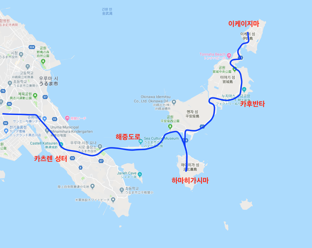 카츠렌 성터 -> 해중도로 -> 하마히가시마 -> 카후반타 -> 이케이 비치