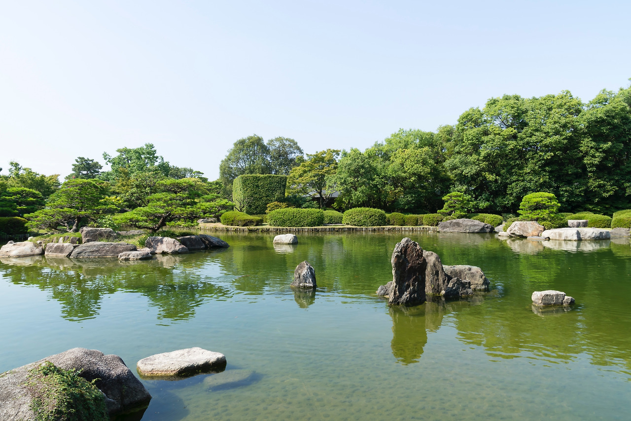 정원 중간에는 커다란 연못이 있고 연못 주변으로 무심한 듯 놓인 돌과 잘 가꾸어진 소나무가 보인다. 방문객이 많지 않기 때문에 차분히 정원을 한 바퀴 돌며 생각에 잠기기 좋다. 모든 것이 멈춘 듯 고요함이 정원을 가득 채우고 있고, 중간 중간 흐르고 있는 물소리가 간간히 들려온다. 후쿠오카 시민들에게는 결혼사진을 찍는 장소로 일본 전통 예식 의상을 입고 정원을 돌며 사진을 찍는 이들을 종종 만날 수 있다. 계절에 따라 정원의 풍경과 색깔도 달라지는데, 봄에는 꽃들로 현란한 모습을 선보이고, 여름에는 푸른 나뭇잎을, 가을에는 울긋불긋 단풍을 볼 수 있다.