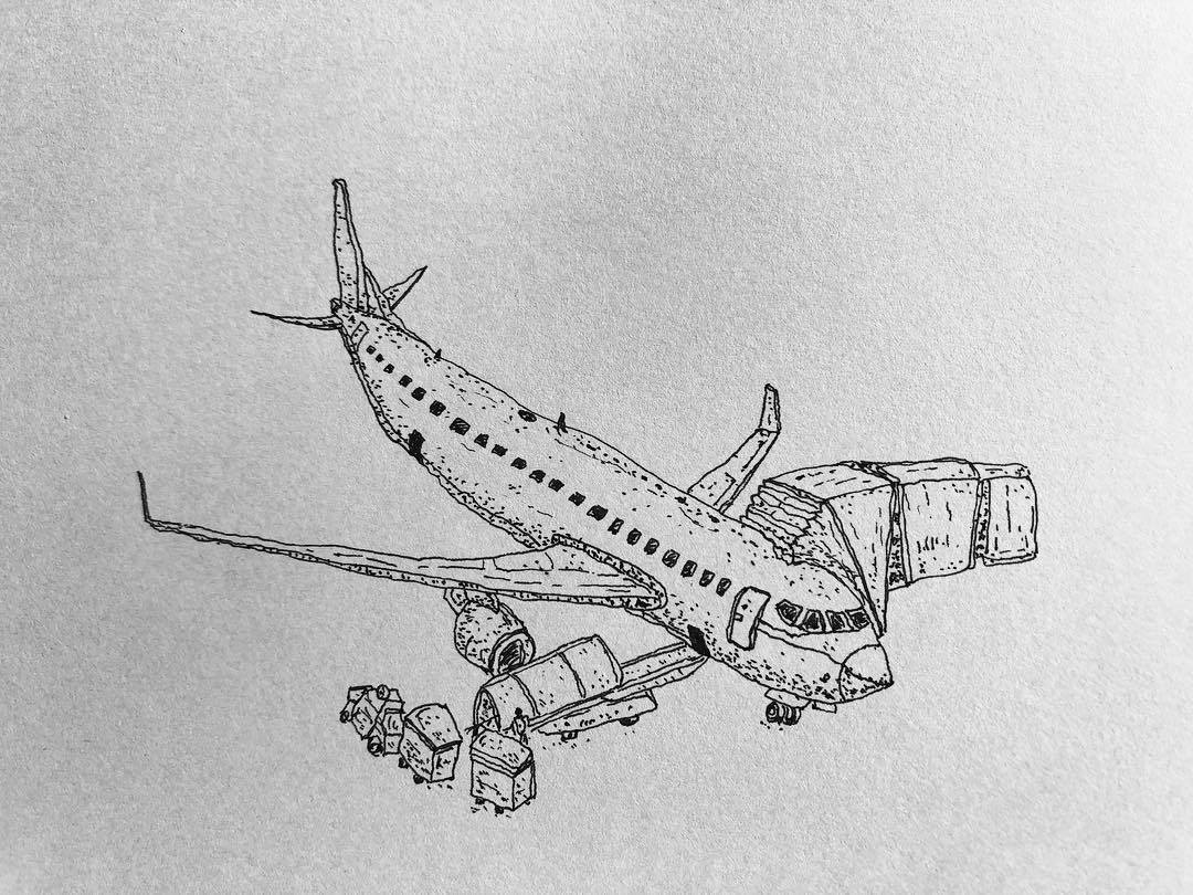 비행기에서 창밖을 감탄하며 바라보는 중에 기내식을 먹고, 펜과 종이를 꺼내서 이륙 전 비행기를 그렸다. 흔들리는 비행기에서 종이에 펜으로 그림을 그리는 것은 생각하는 대로 선을 그리기가 쉽지가 않았지만, 잘 그리고 안 그리고를 판단할 필요가 없다.