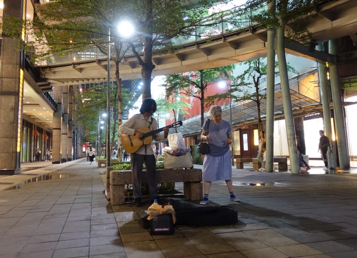 101 타워 부근에서 버스킹을 보고 있는데 갑자기 할머님 한분이 춤을 추면서 분위기를 더 뜨겁게 만들었어요