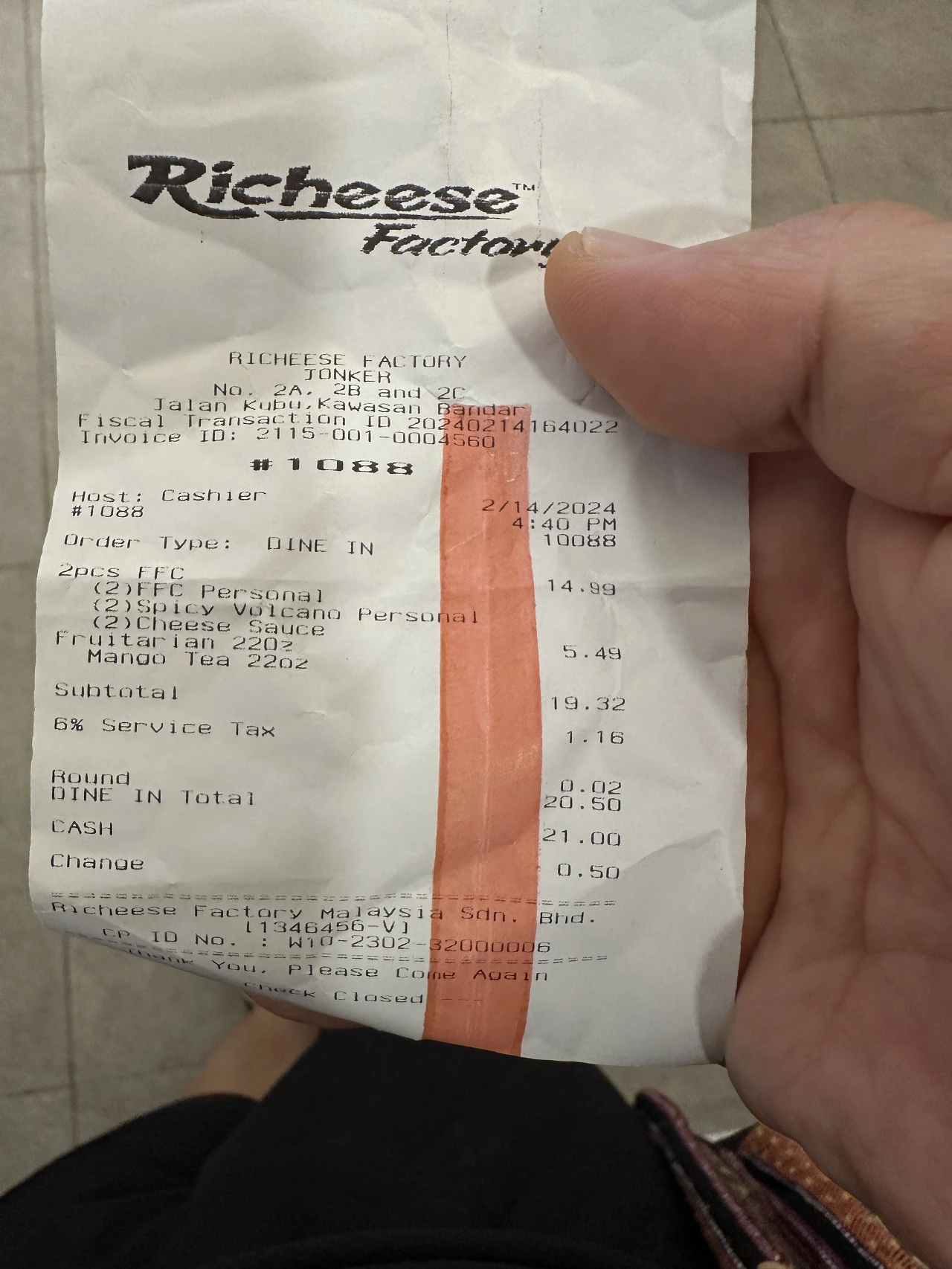결제금액: RM27 = 음식(25.5) + 자리값(1.5)