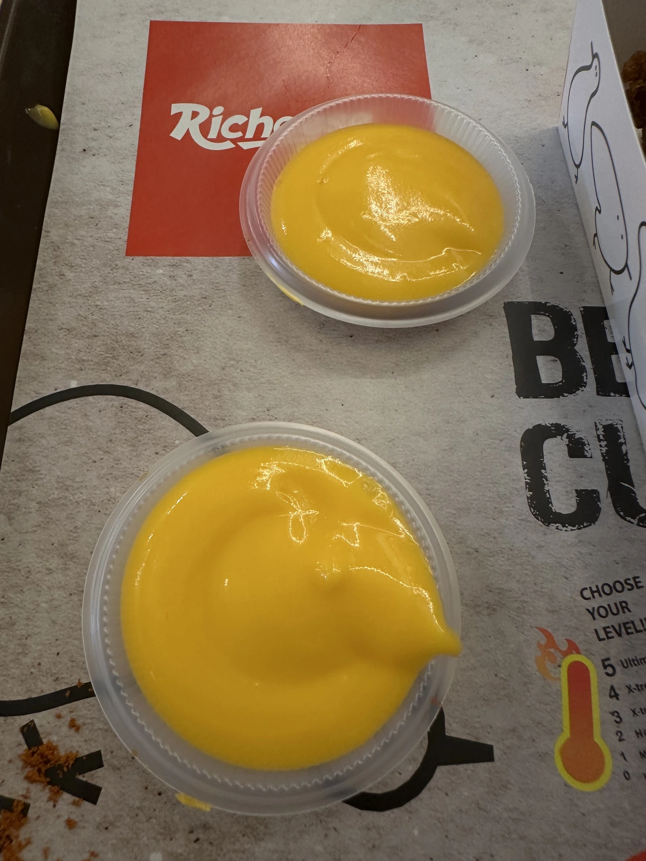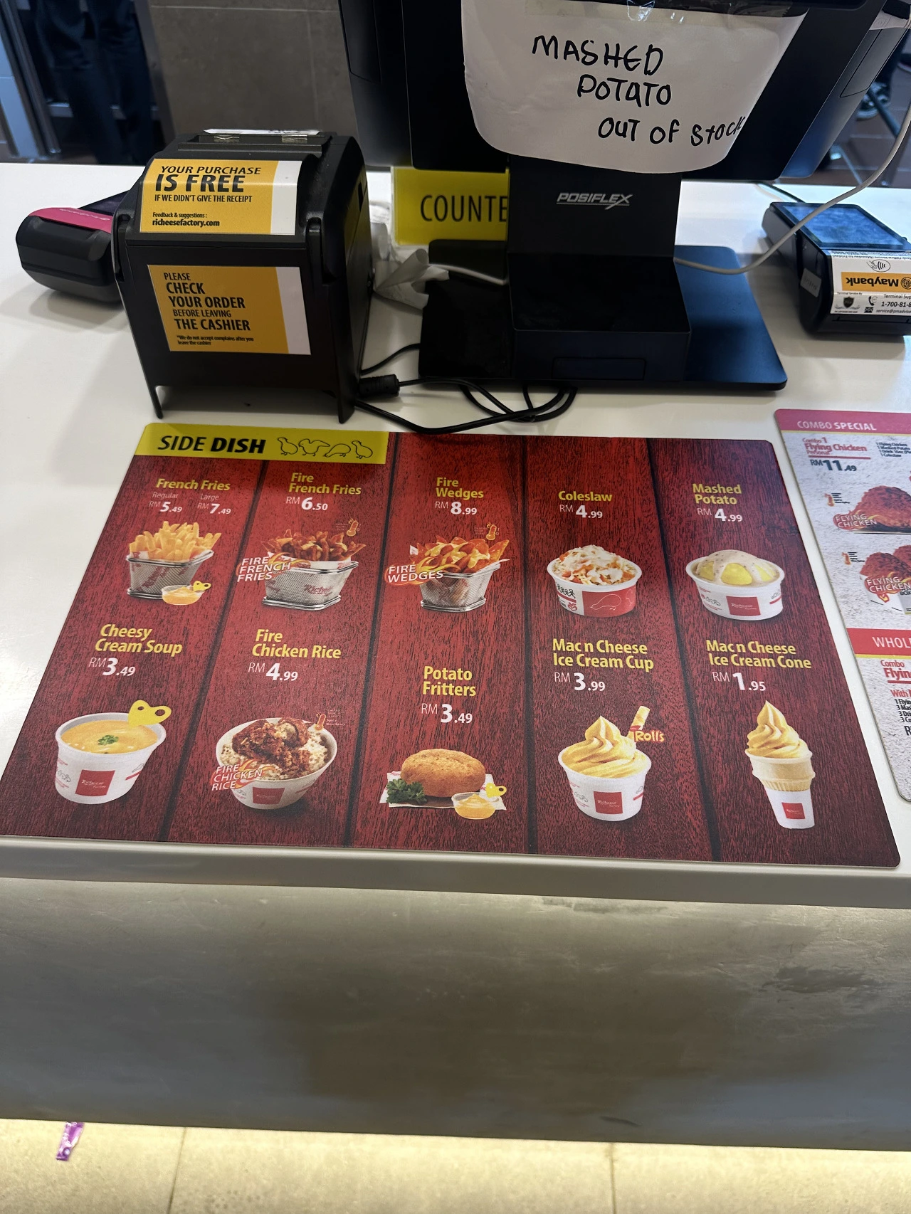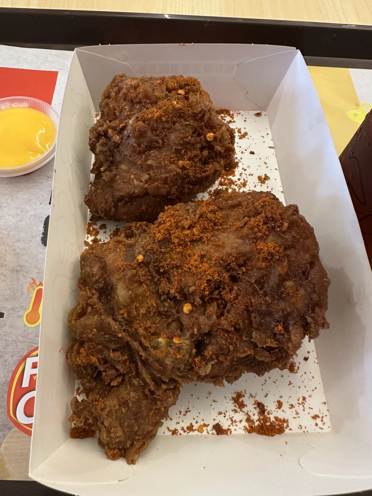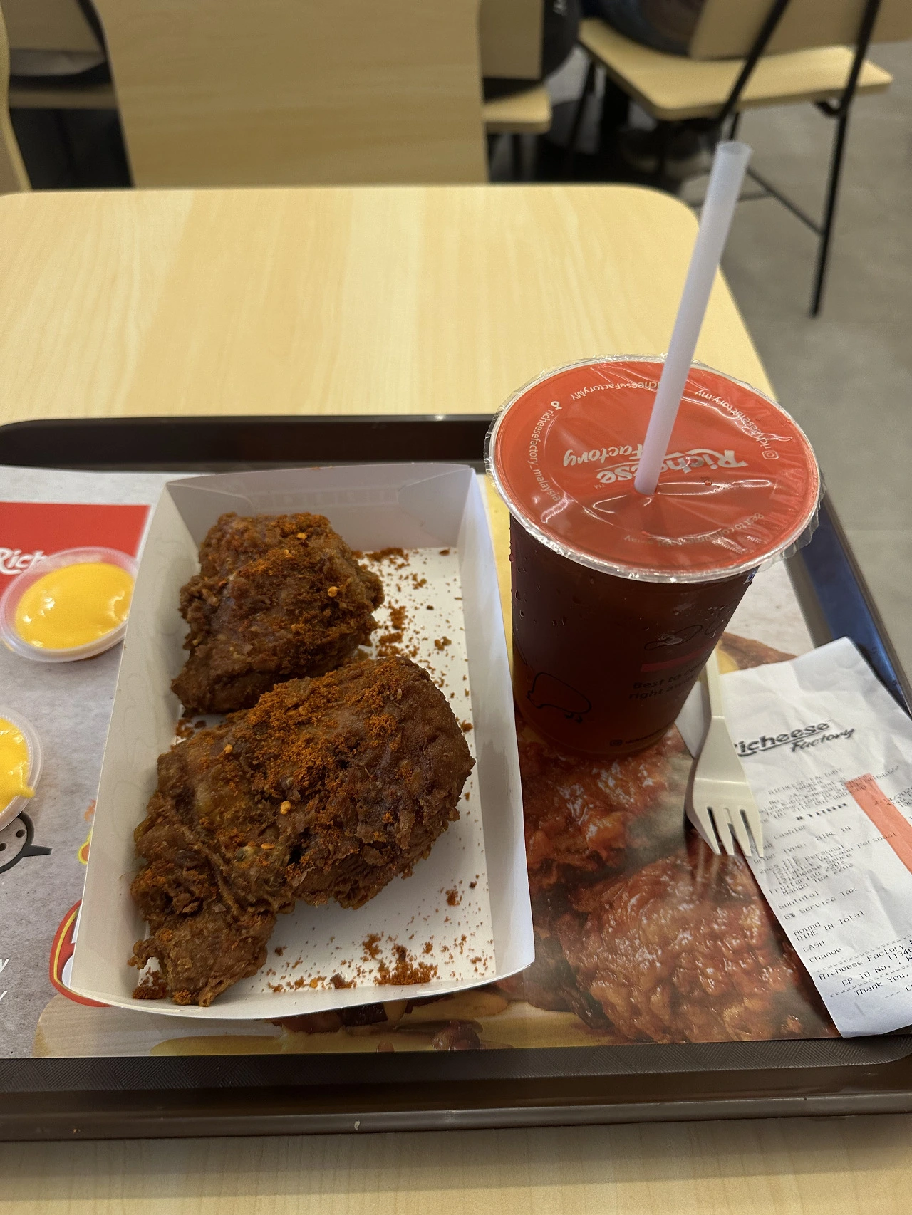 1. 치킨 2조각(RM14.99) - 매운맛이 맵긴 했는데 어색한 느낌의 매운맛, 찍어먹는 치즈가 같이 나왔는데, 어색한 매운맛을 중화시키는 기능을 함.