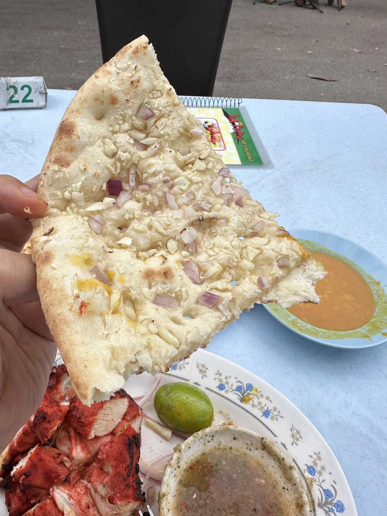 2. 마늘, 양파 난(RM4.5) - 거의 레귤러 피자 사이즈의 난. 맛있다 맛없다 할 메뉴는 아닌 거 같아요. 그냥 딱 난입니다. 한국에서 먹던 거랑 비교하면 조금 더 두껍고 부드러운 느낌.