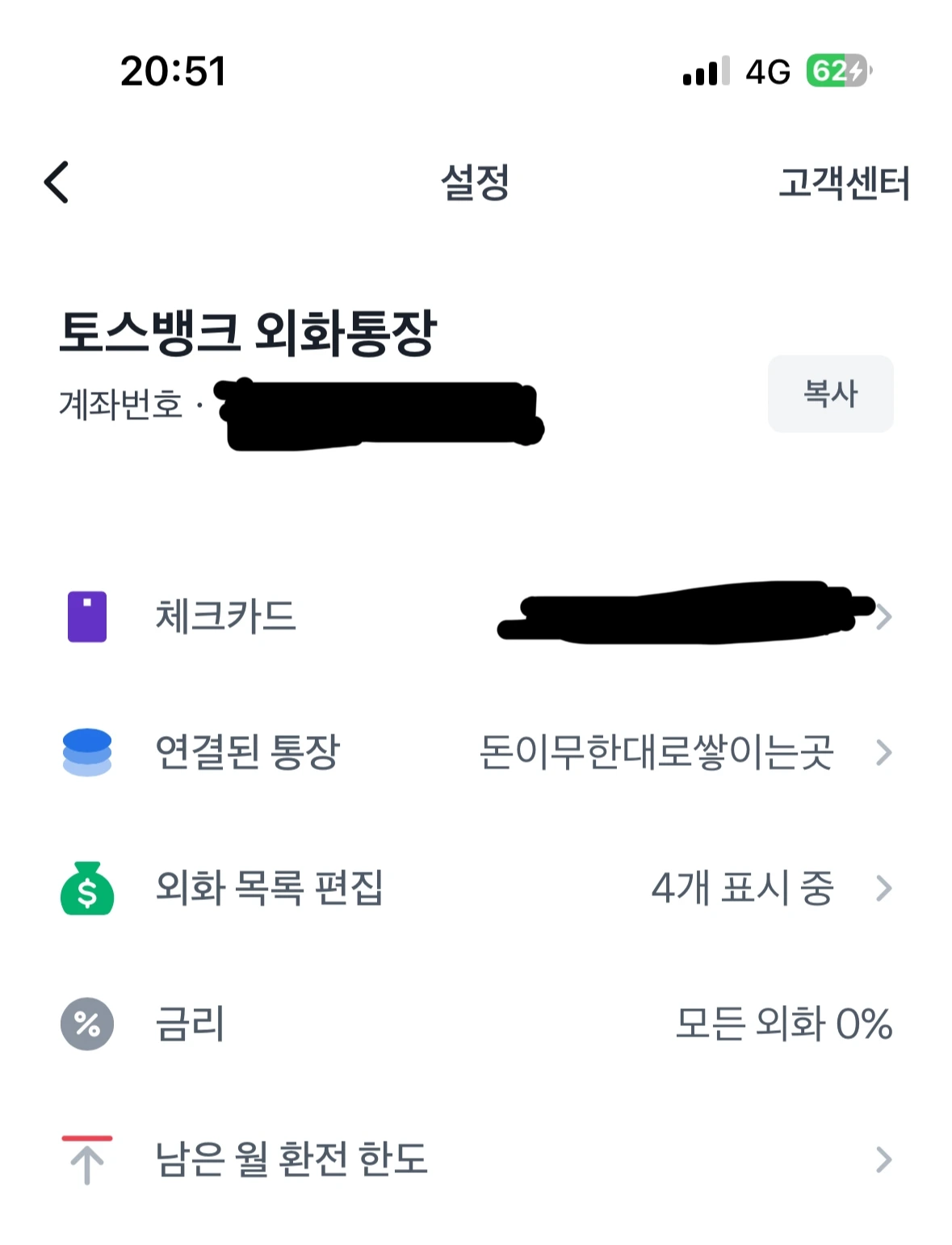 참고로, 얼마 전부터 토스에 외화통장이 생겼고, 체크카드를 외화통장과 연결(아래 이미지 참고)해서 사용이 가능합니다. 외화를 충전(100% 우대)해서 사용하는 건 트레블월렛이랑 비슷합니다.