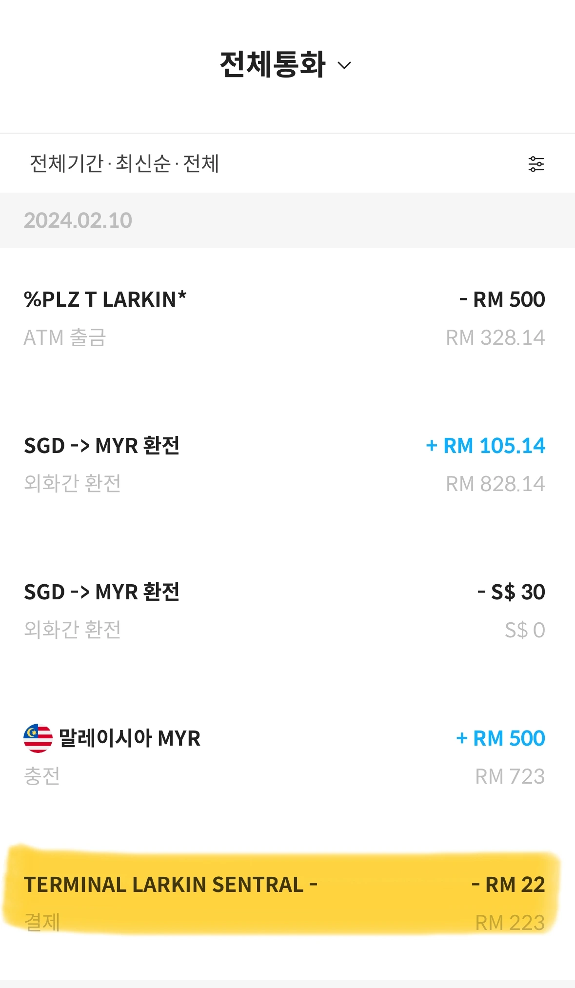 3. ATM출금: 충전된 금액에서 인출이 되기 때문에 수수료가 없음. 옆 이미지에서 확인 가능(500링깃 충전, 500링깃 인출)