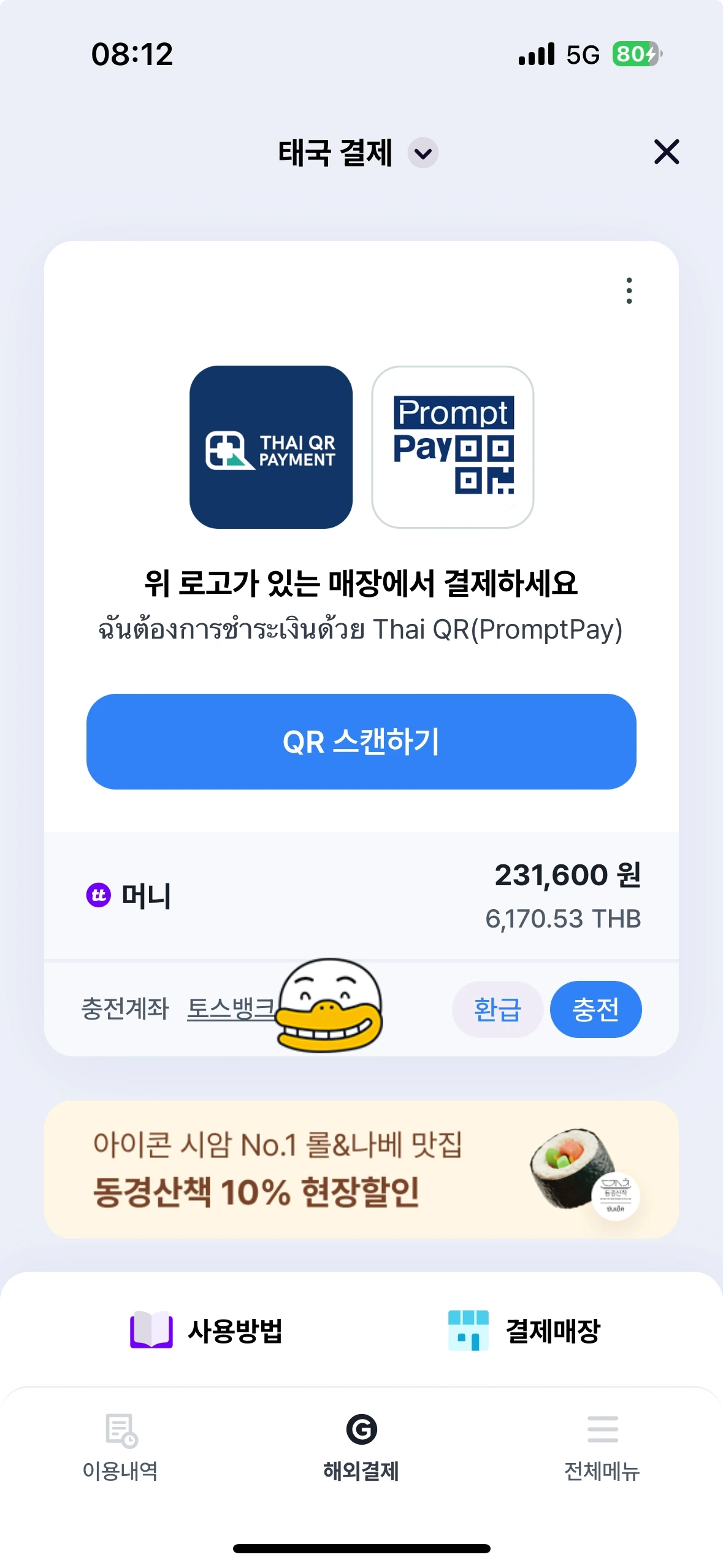 해외에서 결제를 할 때 환전, ATM 인출, 카드를 주로 사용했고, 시장이나 많은 가게에서 카드사용이 어려울 때는 토스의 GNL해외결제 기능으로 QR결제를 주로 이용해 왔습니다. 이때는 통장에서 출금내역을 실시간으로 확인할 수 있어서 더 마음에 들었던 기능이고, 결제 후 잔돈으로 동전을 안 받아서 너무 좋았네요(동전이 생각보다 무거움)