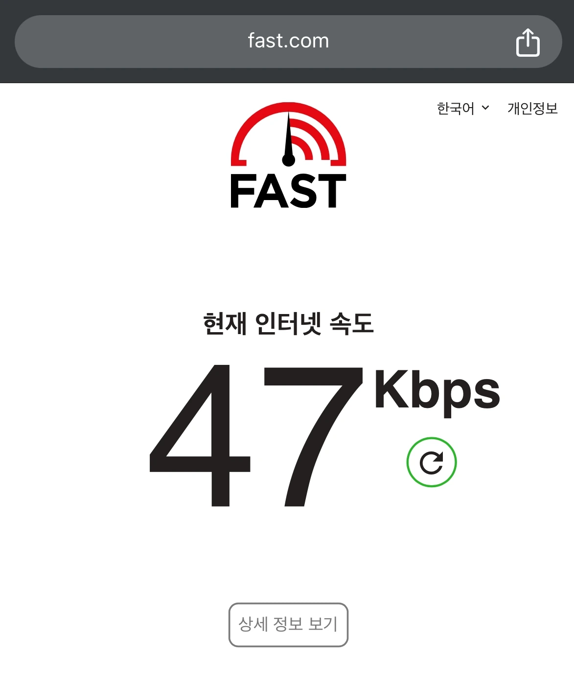 10. 속도가 개판(웹페이지도 안 열리는 속도, 47 kbps)