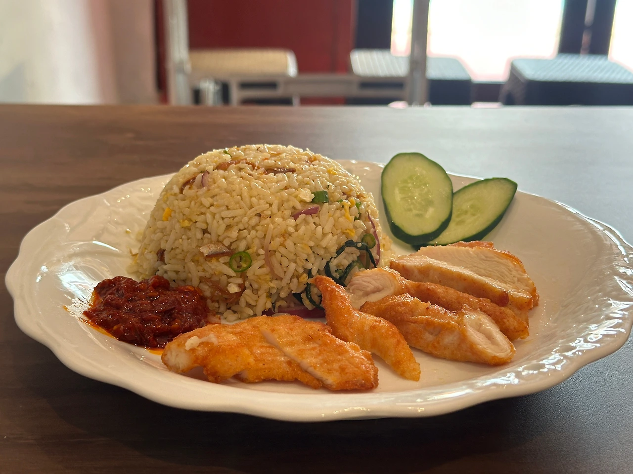 메뉴판을 보고 고민을 하다가 주방장 추천메뉴 Kampung Fried Rice를 주문했어요(솔직히, 뭔지 모르고 주문함) 사진과 같이 볶음밥에 튀긴 치킨, 오이, 약간 매운 양념 이렇게 나왔네요.