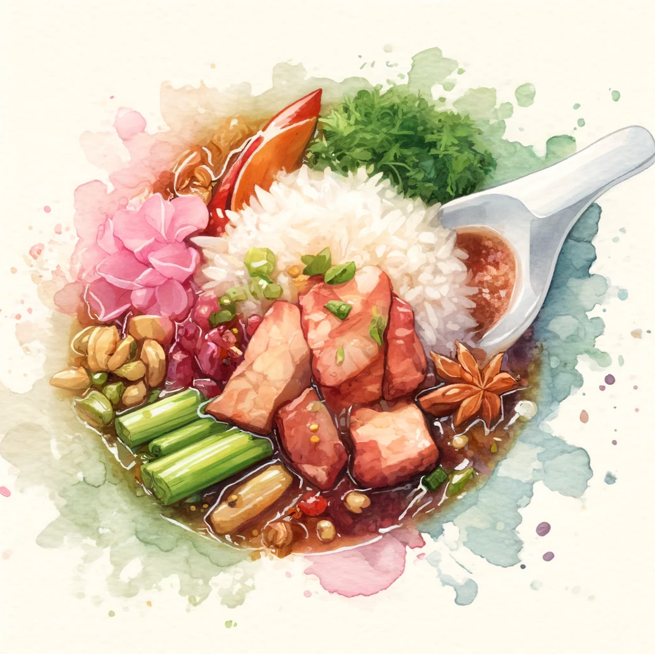 ข้าวขาหมู (카오카무): '족발 덮밥'을 의미합니다. '카오'는 '밥'을 뜻하고, '카무'는 '족발'을 뜻합니다. 따라서 '카오카무'는 족발 덮밥입니다.