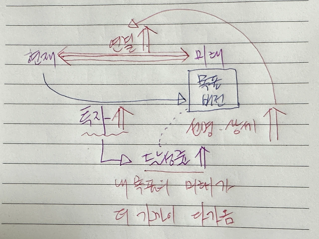 첫 번째 이야기(https://brunch.co.kr/@tripdrawing/275)에 이어서 내용을 요약하는 그림을 그려보았습니다. 이전 그림은 현재의 내가 미래의 목표를 설정하고 연결된다는 내용이었습니다.