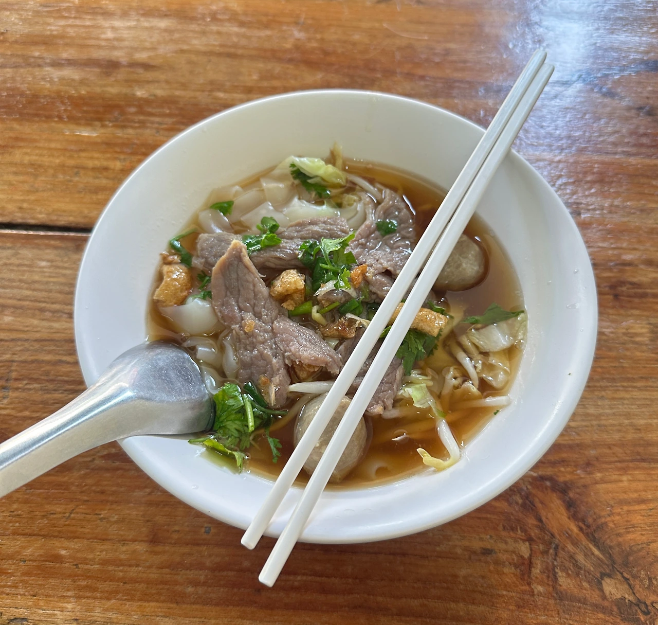 면은 쫄깃한 쌀국수(เส้นใหญ่, 센 야이)가 담기는데, 이 식당에서는 항상 넓은 면이 사용됩니다.