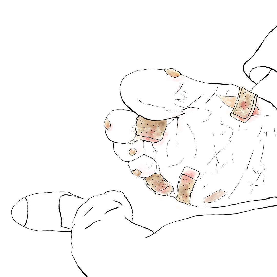 3일이 지났을 무렵 발바닥과 발가락은 엉망이 되어 버렸다. 발가락의 물집과는 상관없이 발바닥이 바닥에 닿을 때마다 수백 개의 바늘로 마구 쑤셔대는 고통을 느꼈다.