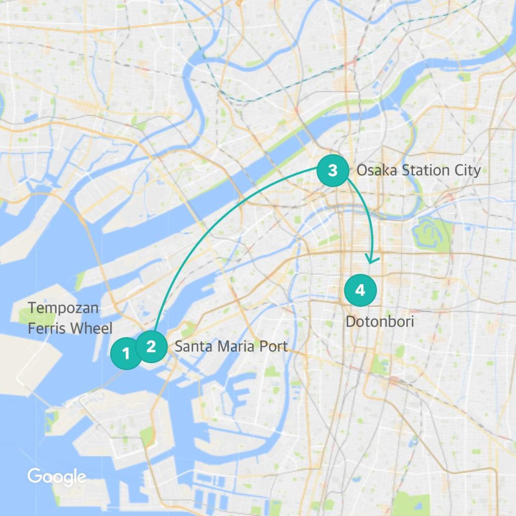 항구 도시의 묘미를 느낄 데포잔 대관람차 탑승으로 여행 시작. 산타마리아호 크루즈로 유니버설 스튜디오부터 가이유칸까지 두루두루 관람한다. 오사카 스테이션 시티에서 한적한 쇼핑후 저녁을 먹고 도톤보리에서 길거리 야식을 먹으면 끝!