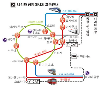 일본 국철인 JR나리타공항역에서 도쿄 시내 곳곳으로 갈 수 있는 전철 노선을 이용하는 방법. ‘나리타 익스프레스’를 이용하면 도쿄역까지 약 55분, 신주쿠 역까지 약 80분 소요된다.