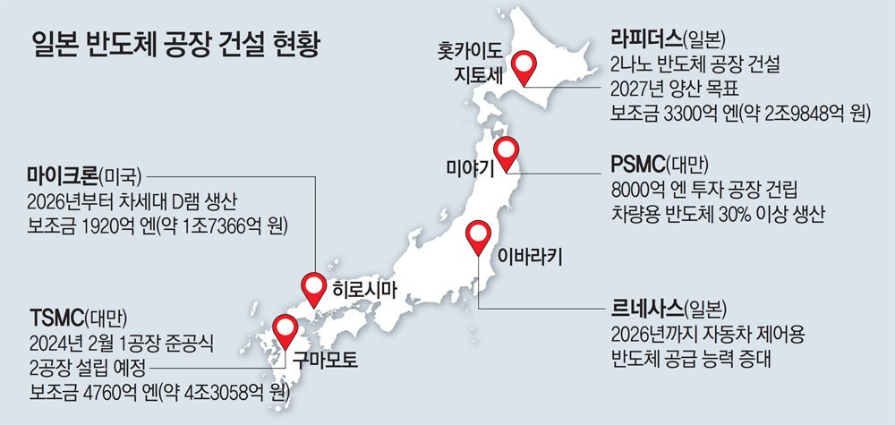 일본도 마찬가지입니다. 현재 일본은 자국의 반도체 산업 부흥에 드라이브를 걸면서 전국에 반도체 공장을 지어대고 있는 상황입니다. 꼭 자국 기업에 의한 제조는 아니더라도 반도체 생산 거점으로서의 영광을 되찾겠다는 것인데, 만약 한국·대만과 반도체 협력을 한다면 이런 목표를 다소간 수정해야 할 것입니다. 그런데 일본 입장에서 굳이 그래야 할 필요를 느낄까요? 반도체 소재·장비는 독점하고 있지만 일본은 그 시장에만 만족할 생각이 없고, 그 욕심을 뒷받침해 줄 국력이 있습니다.