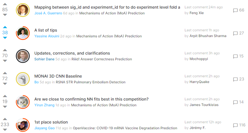 케글에서는 좋은 comment나 좋은 질문, tip 등을 discussion에 올리면 upvote를 받을 수 있고 많이 받으면 rank가 올라