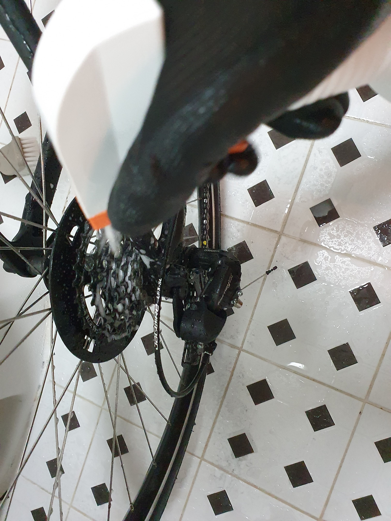 체인과 기타 부분들에 세정제를 뿌리자마자 검은색 기름때가 엄청나게 떨어집니다.이후 주방용 세제로 자전거를 전체적으로 닦아주면 됩니다.