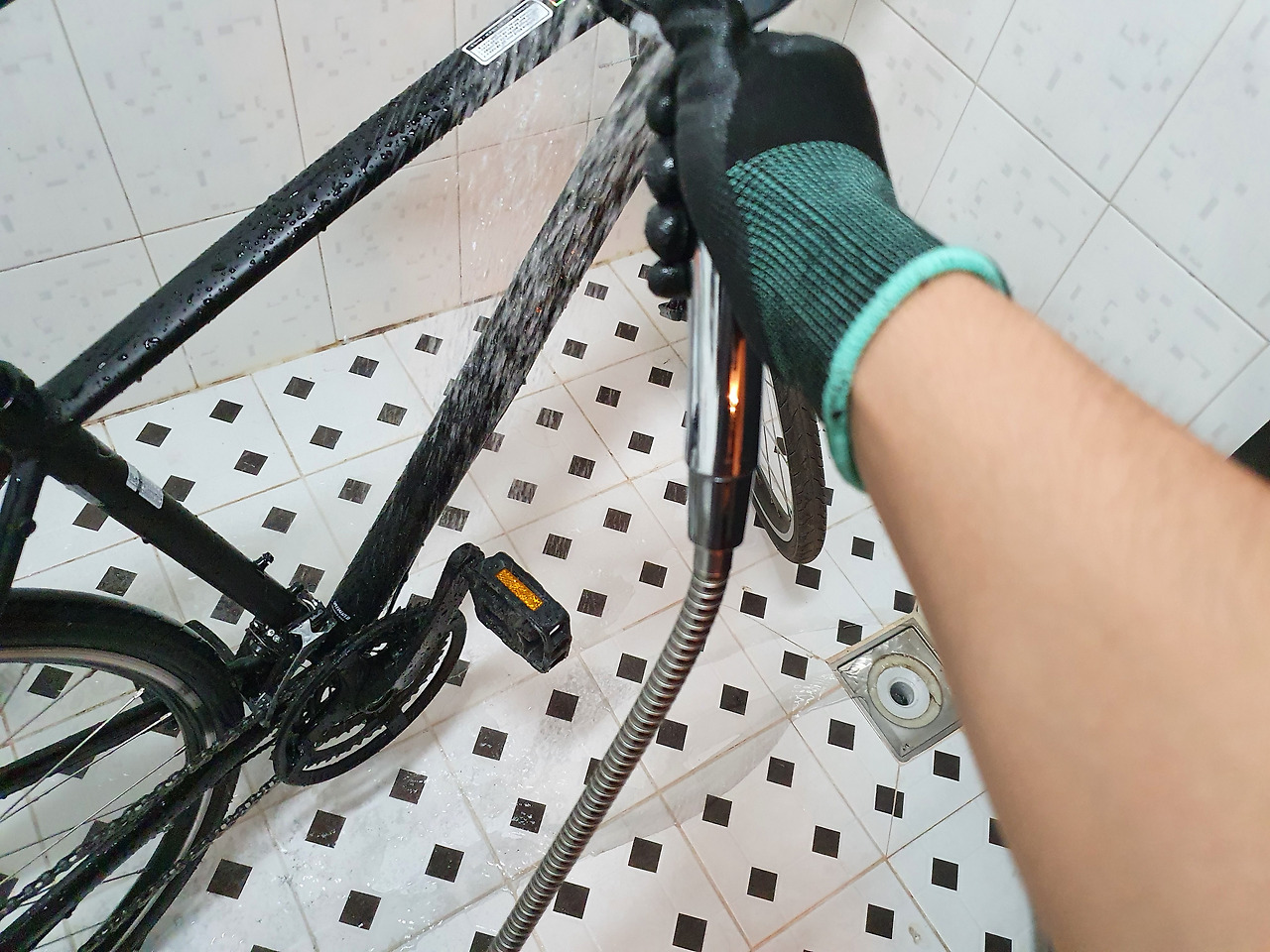 우선, 자전거에 물을 뿌려줬습니다. 여기서 중요한 점은, 자전거 핸들과 스템(앞바퀴와 핸들 사이의 연결부위) 쪽에는 물을 뿌리면 안 됩니다. 저 부분은 물이 묻으면 내부에서 녹이 생기게 되고, 기름이 묻지 않는 곳이라 굳이 물과 세제로 씻을 필요가 없거든요. 저 부분만은 피해서 물을 뿌려줍니다. 물을 뿌려주는 것만으로도 자전거에 붙은 진흙이나 먼지 등은 대부분 사라진다고 보시면 됩니다.