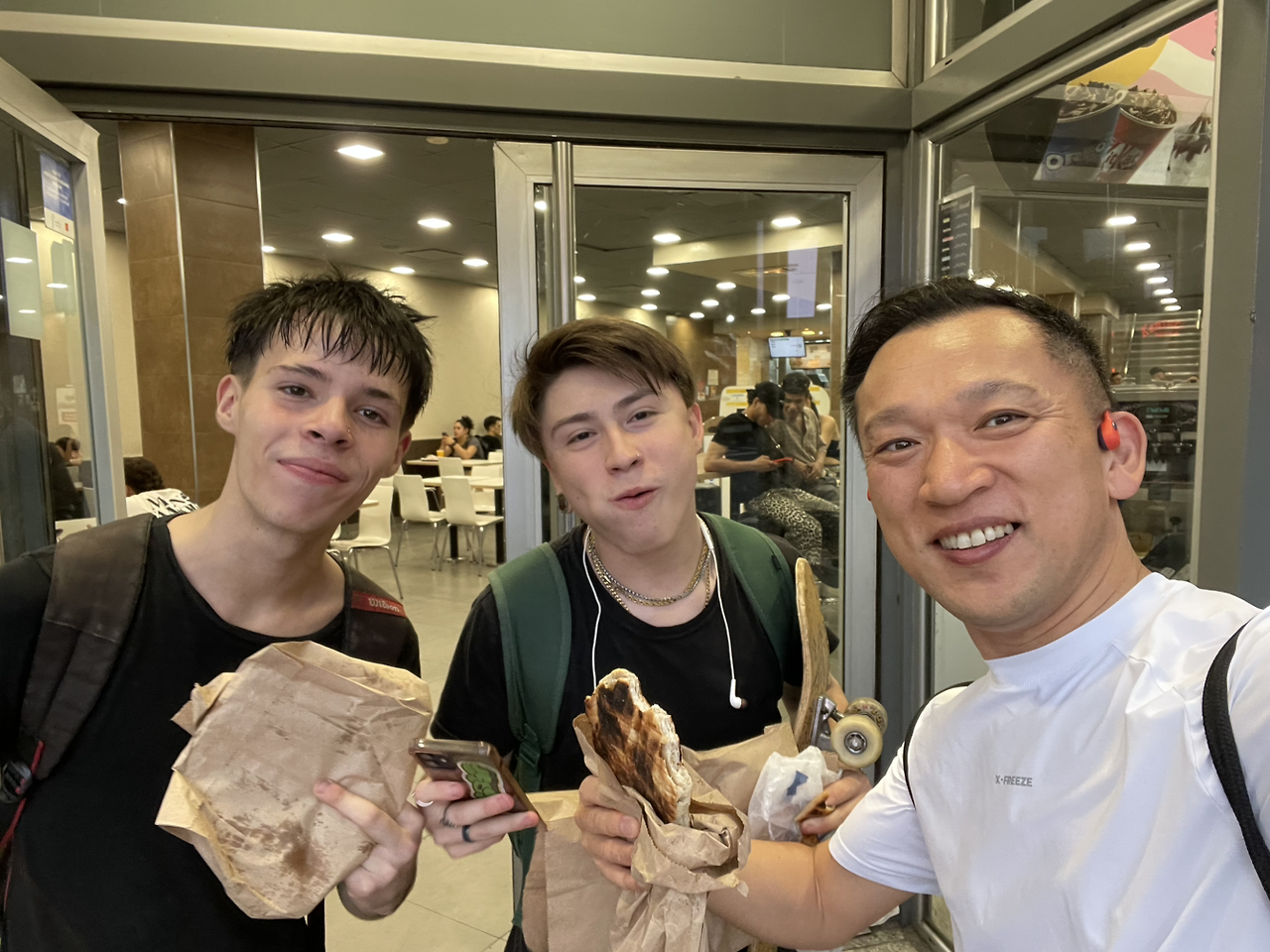 빵을 들고 천천히 걸어가는데 스케이트보드를 손에 든 아이들이 무리를 지어 지나갔다. 가는 방향이 같아 함께 걷다 보니 어느새 맥도날드 앞에 이르렀고, 그중 한 아이가 다가와 사진을 같이 찍자고 했다. 망설일 것도 없이 "좋지!"라며 웃으며 응했고, 다 함께 사진을 찍었다. 아이들은 어디에서 왔느냐고 물었고, 틱톡을 하냐는 질문도 던졌다. 그들의 장난기 가득한 표정과 자연스러운 호기심이 유쾌했다. 짧은 대화를 나누고, 아이들은 스케이트보드를 튕기며 반대편 골목으로 사라졌다.