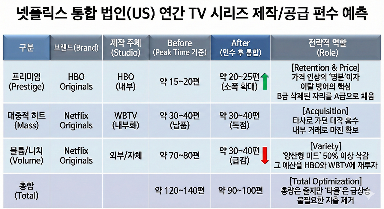 과거 넷플릭스는 소니나 파라마운트 같은 '외부 스튜디오'에서 드라마를 비싸게 사 왔다. 제작 원가에 15~20%의 마진을 얹어줘야 했다. 하지만 인수가 완료되면 할리우드 최대 TV 제작 공장인 '워너 브라더스 텔레비전(WBTV)'이 넷플릭스의 자회사가 된다. 남에게 줄 마진을 아껴서 제작비에 더 태우거나, 비용을 절감할 수 있다. "남의 공장에서 제작하던 것을 사내 공장에서 직접 만드는 구조"로 바뀐다. 물론 미국식 수직구조의 특성상 외부 사업자를 위해 콘텐츠를 제작하기도 하겠지만, First look은 넷플릭스가 보유하고 있을 것이기에 상대적으로 양질의 콘텐츠를 수급할 수 있는 구조는 만들어질 것으로 보인다. 경쟁사로 갈 뻔한 A급 콘텐츠들이 넷플릭스 오리지널로 귀속되면서, 넷플릭스 오리지널의 타율은 비약적으로 상승하게 된다.