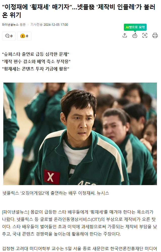 최근 드라마 회당 제작비가 15억 원을 넘어선 건 예전이고 곧잘 30억 원 때다. 겨울연가가 회당 1억대였고, 도깨비가 회당 10억이었지만, 지금은 언제적 이야기인가 싶다. 이 대목에서 많은 이들이 넷플릭스를 비롯한 글로벌 OTT가 불러온 '주연 배우 몸값 인플레'를 주범으로 지목했다. 일부이긴 하지만 주연배우에게 '횡재세'를 부여하자는 주장까지 나왔다.