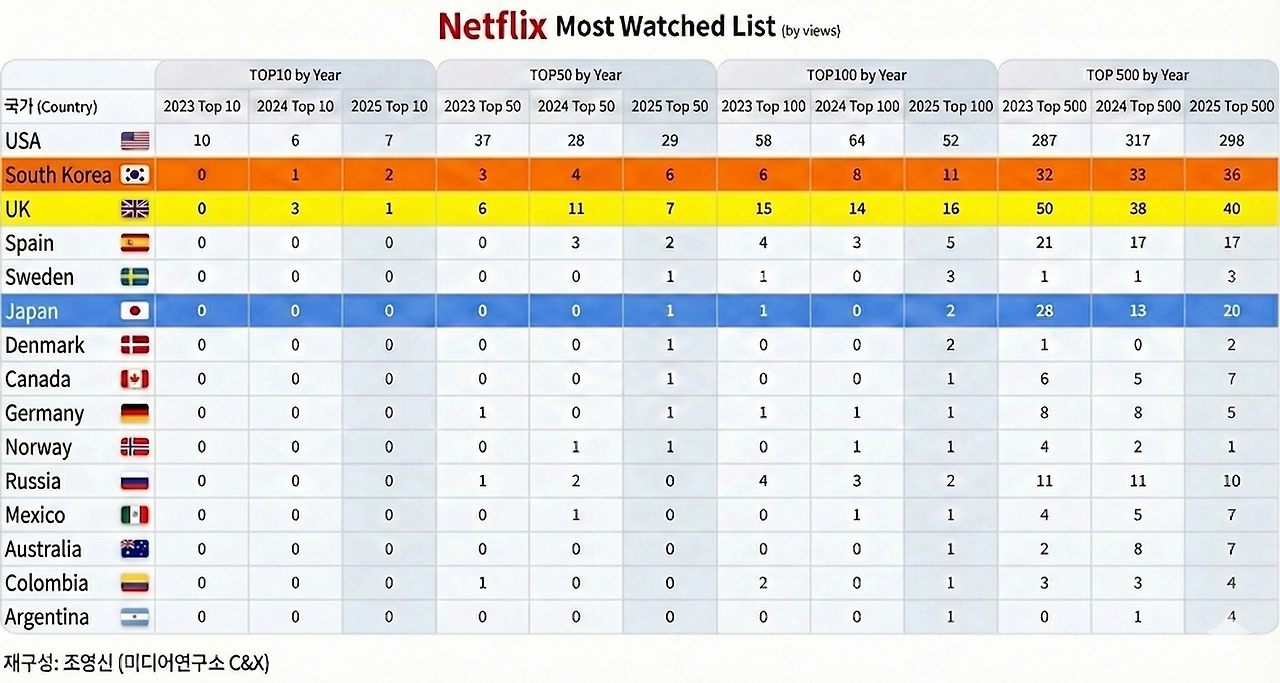 한국을 우선해 보면, 2023년에는 TOP10에 한편도 올리지 못하다가 24년 25년 각 1편과 2편을 올렸다. TOP50, TOP100까지는 눈에 띄는 증가를 보이지만, TOP500에서는 숫자의 변화가 거의 없다. 이는 K-Drama가 넷플릭스를 통해서 글로벌로 유통되는 총 물량이 부족한 탓일 거다. 의외로 한국 넷플릭스에서만 볼 수 있는 콘텐츠의 양은 증가하고 있지만, 글로벌 유통권을 확보한 K-Drama의 숫자는 일정 규모 이상 늘어나지 못한 탓이다.