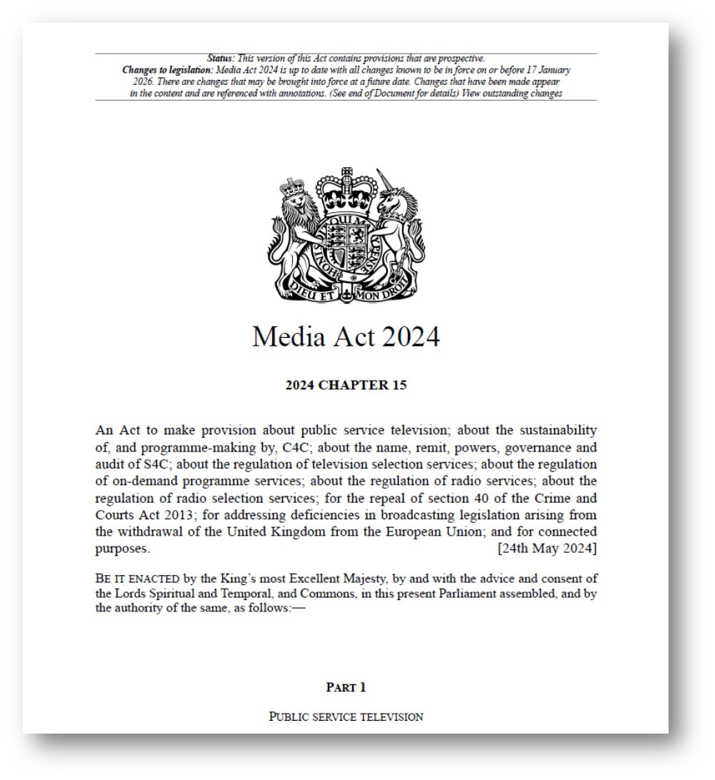 퇴로(지상파 종료)가 확인되자, 진입로(인터넷 플랫폼)를 확보하기 위한 법적 조치가 뒤따랐다. 영국 의회는 2024년 5월, 20년 만에 방송법을 대대적으로 손질한 <미디어 액트>(MediaAct2024)를 통과시켰다. 약육강식의 전쟁터인 디지털 시장에서도 공영 방송이 보편성을 확보할 수 있도록 국가가 일종의 안전지대를 만들어 준 것이다. 이번 미디어액트를 한마디로 규정하면 바로