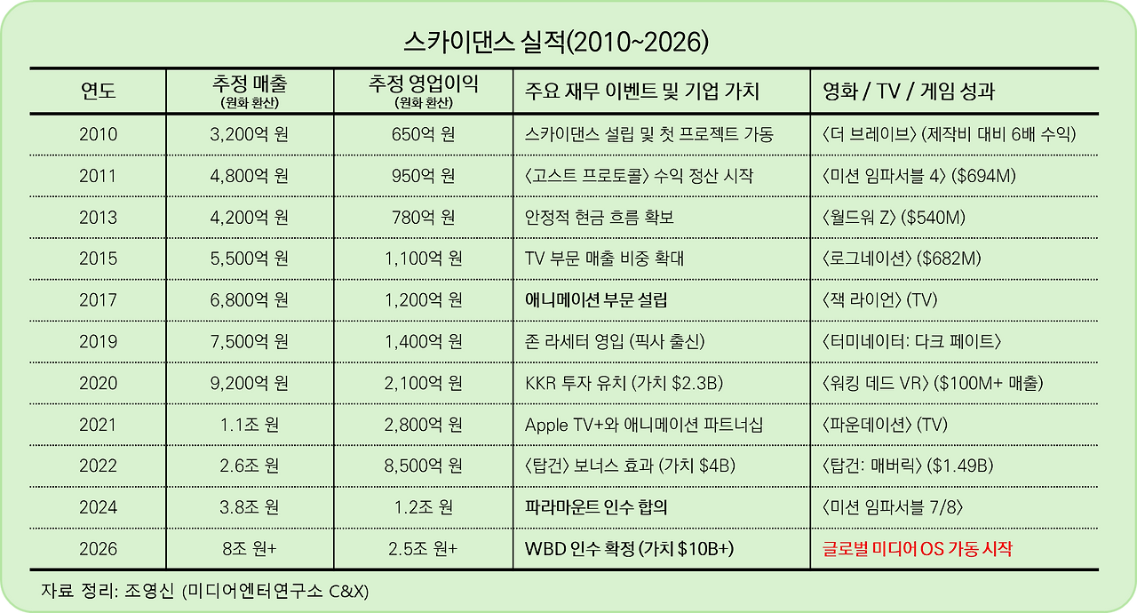 이제 겨우 15년 남짓된 제작사인 스카이댄스가 왜 파라마운트를 인수하기로 했고, 2025년 8월 인수가 완료되자마자 바로 WBD 인수를 결정하는 것은 이례적이다. 스카이댄스의 기존 투자회자인 레드버드캐피털이 현금 출자를 했고, 아버지인 래리 엘리슨이 약 60억 달러의 개인 자금을 투입해서 80억 달러(약 11조 원)로 파라마운트를 인수했다곤 하지만, 거기엔 146억 달러(약 20조)의 빚까지 승계했다. 갚아야 할 것이 너무 많다는 이야기다.