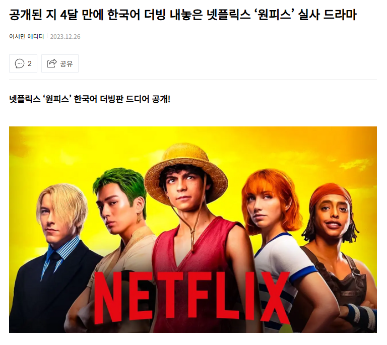 그런데 한국에서는 또 다른 맥락에서 원피스 마니아들 사이에서 호평을 받기 시작했다. (물론 <원피스> 공개 후 4개월이 지난 시점에서야 한국어 더빙판이 공개되긴 했었다)