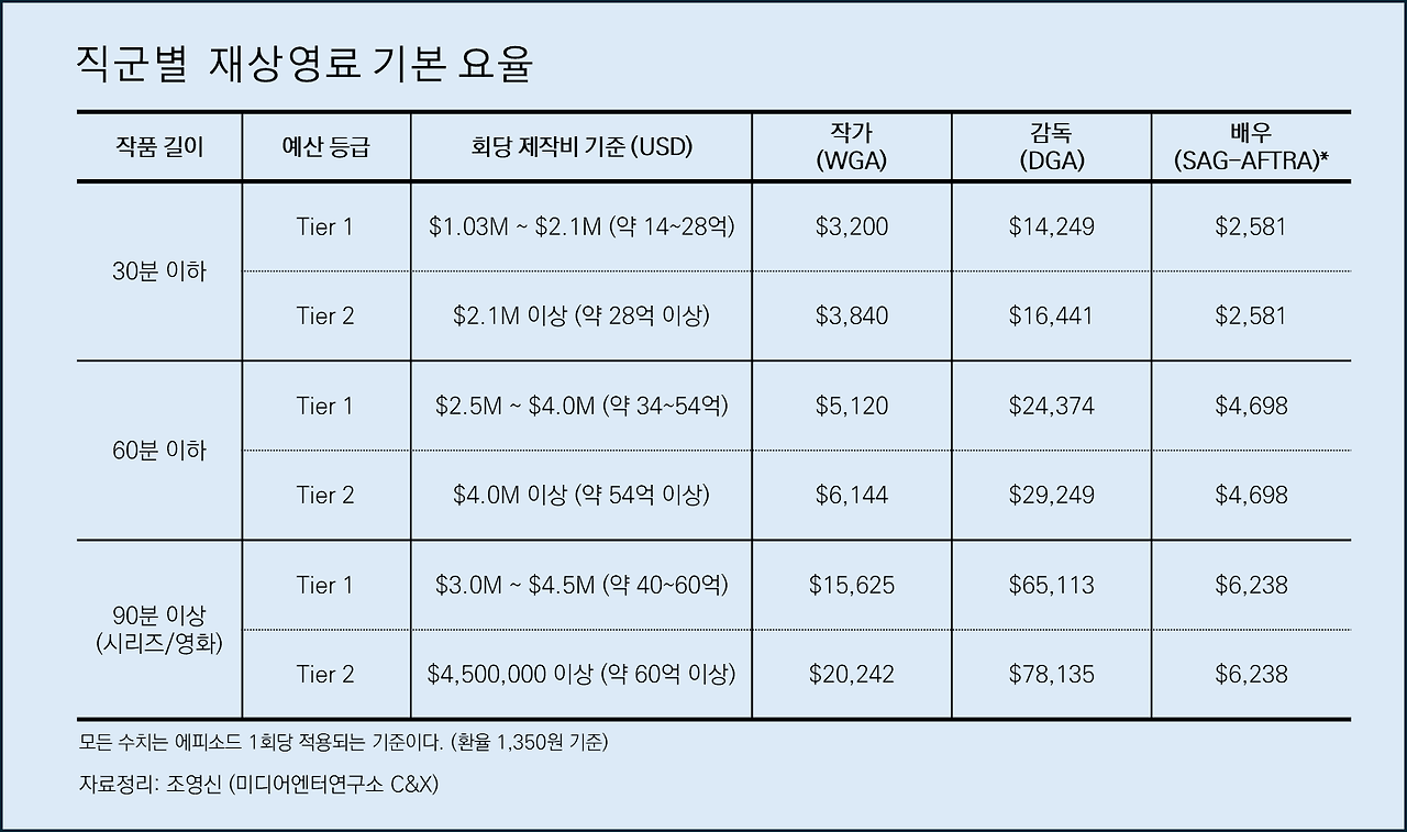 (글쓴이 주) 지난 글에서 북미시장에서 재상영료가 저작권법의 한계를 노동법과 단체협약으로 돌파해 낸 할리우드 창작자들의 전리품이라는 사실을 확인했다. 오늘은 그 구체적인 구조와 산식에 대해서 알아보고자 한다. 재상영료는 구체적으로 어떻게 계산되며, 실제 창작자들의 통장에는 얼마의 숫자가 찍히는가. 그리고 이 정교한 숫자들이 어떻게 글로벌 콘텐츠 시장의 지형도를 바꾸고 넷플릭스의 한국행을 재촉하고 있는지 그 재무적 실체를 파헤쳐 보려고 한다.