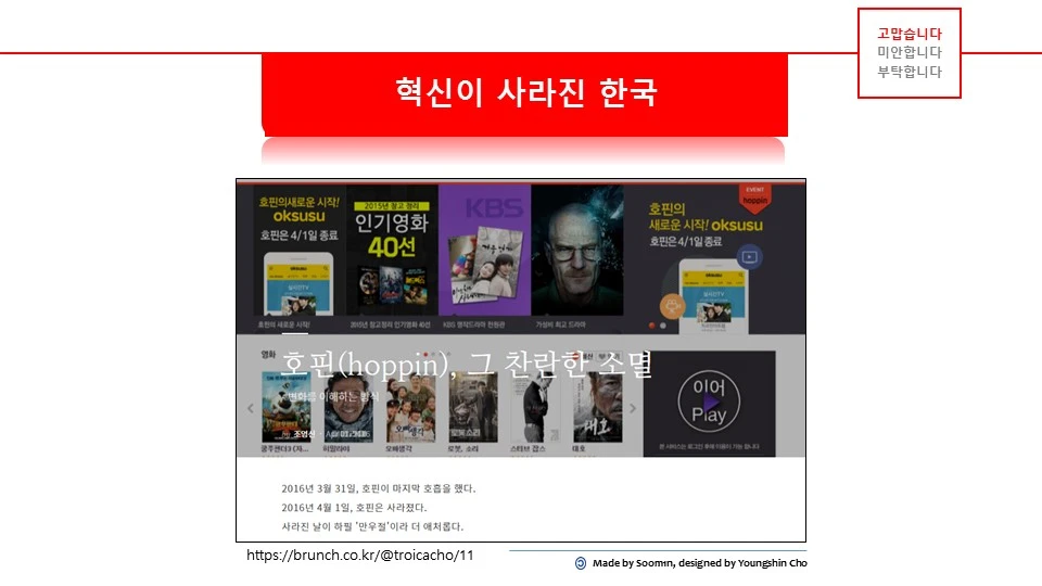 가장 서비스의 완성도가 높았다고 개인적으로 평가하는 호핀은 소멸한 사업입니다. 플랫폼 영역에서 파괴적 혁신이 시도되었으나 결과를 맺지 못했고, 확장되지 못했습니다.