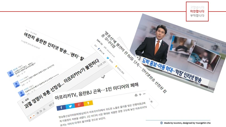 2007년 말부터 슬금슬금 이 시장의 '경박함'과 '저질스러움'을 논하는 글들이 늘어났습니다. 특히 별풍선이라는 전 세계에 유례가 없는 탁월한 BM 구조가 일탈을 조장한다는 이야기도 나오기 시작했습니다. KBS 뉴스 시간에도 언급될 정도였으니까요? 규제를 해야 하지 않느냐는 소리가 종종 나오기 시작했습니다.
