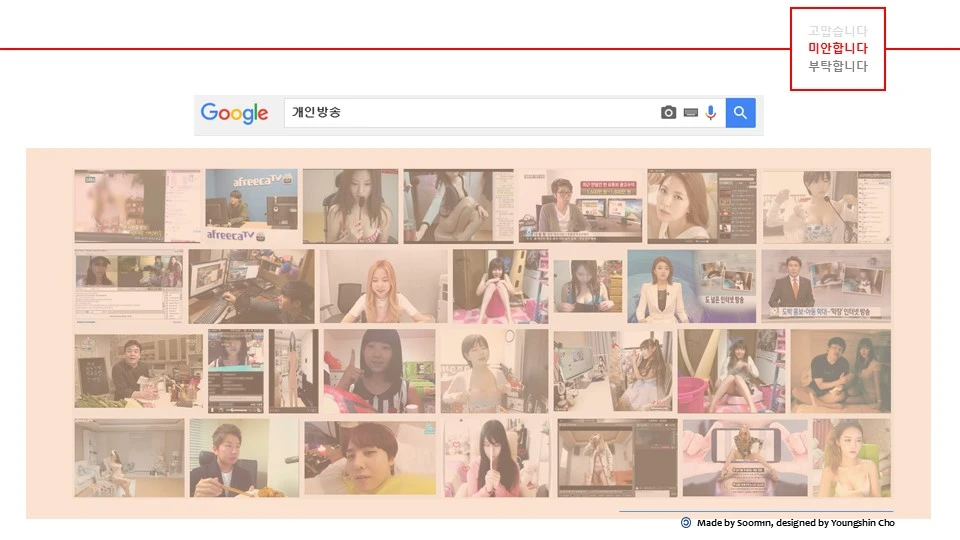 많은 사람들이 이 시장에 뛰어들었고, 늘어난 숫자만큼이나 일탈은 늘었습니다. '개인방송'으로 간단히 구글링을 해 보면 제법 요상한 사진들과 자태들이 드러납니다.