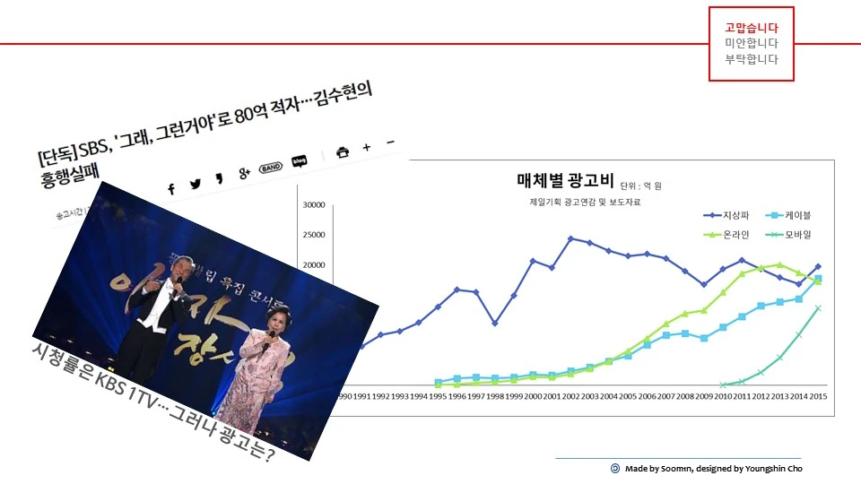 2015년도에 있었던 <KBS 공사 창립 콘서트>는 이미자와 장사익을 내세웠습니다. 시청률 20.1% 기록했으니 꽤 성공적인 기획인 거죠. 그런데 시청자를 분석해 보면 시청한 이들의 80%가 50대 이상입니다. 광고 수익이 하락하는 건 어쩌면 당연하다는 거죠.