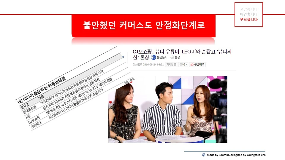 불안해 보였던 커머스 시장도 홈쇼핑 사업자의 손을 잡고 조금은 안정화될 듯싶습니다. 전 크리에이터 중심의 커머스 시장은 뉴스 시장의 블로거와 흡사하다고 합니다. 한때 파워 블로거들이 수억의 수익을 올리던 시절이 있었죠. 새로운 뉴스 시장을 개척했다는 이야기도 많이 들었습니다. 그 파워 블로거들이 어느 날부터인가 상품 리뷰 등을 통해 커머스 시장에 간접 진출했었죠. 그런데 그 결말이 생각처럼 좋지 않았습니다.