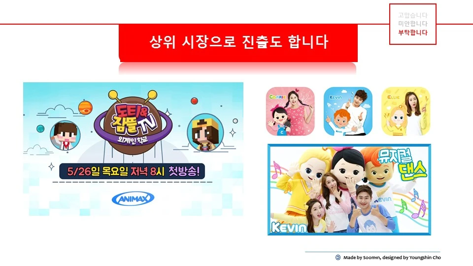 그런가 하면 모바일에 갇혀 있던 콘텐츠가 상위 플랫폼으로 이동했습니다. 100만 가입자를 가진 대표 크리에이터인 도티는 <애니맥스> 채널에 콘텐츠를 제공했고, 캐리 소프트는 오프라인 뮤지컬은 물론이고 EBS와 손을 잡고 어린이 프로그램을 시작합니다.
