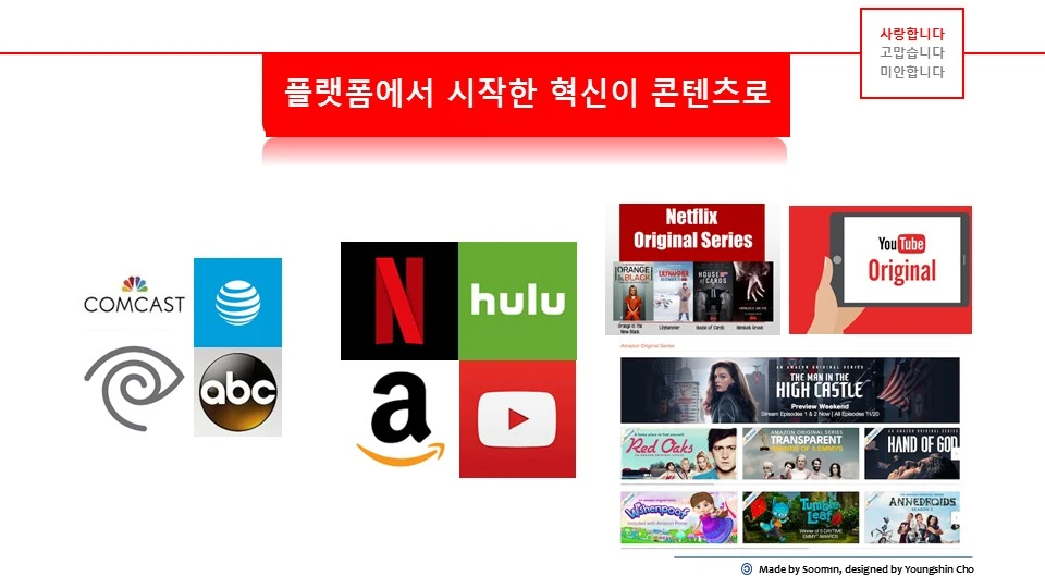 이런 상황들이 복합적으로 반복적으로 일어나면서 어느새 우리는 기존 방송시장에서는 볼 수 없었던 새로운 콘텐츠들을 오리지널(Original)이란 이름으로 볼 수 있게 되었습니다.