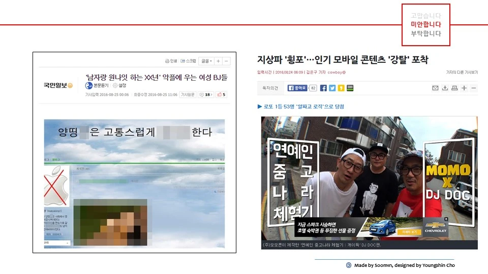 BJ는 경시의 대상이 되었습니다. 국내 최상급 대표 크리에이터를 대상으로 온갖 욕설들을 퍼붓기 시작했습니다. 한쪽의 이야기일 수는 있겠지만 모바일 동영상 사업자의 포맷을 지상파 방송 등이 허락 없이 차용하기도 했습니다.