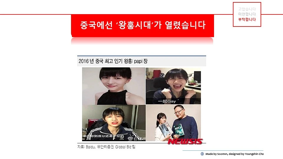 때맞추어 중국에서도 왕홍 경제가 들썩거립니다. 수십조의 시장으로 성장했다는 이야기도 있죠. 누군가는 왕홍 경제가 커져서 한국 사업자가 진입할 기회가 없지 않을까 우려하기도 합니다. 하지만 시장을 개척할 필요가 없고, 있는 시장에 진입할 수 있게 되었다고 생각해 볼 수도 있습니다. 그만큼 위험요소(risk)는 줄어들었다는 셈이죠.