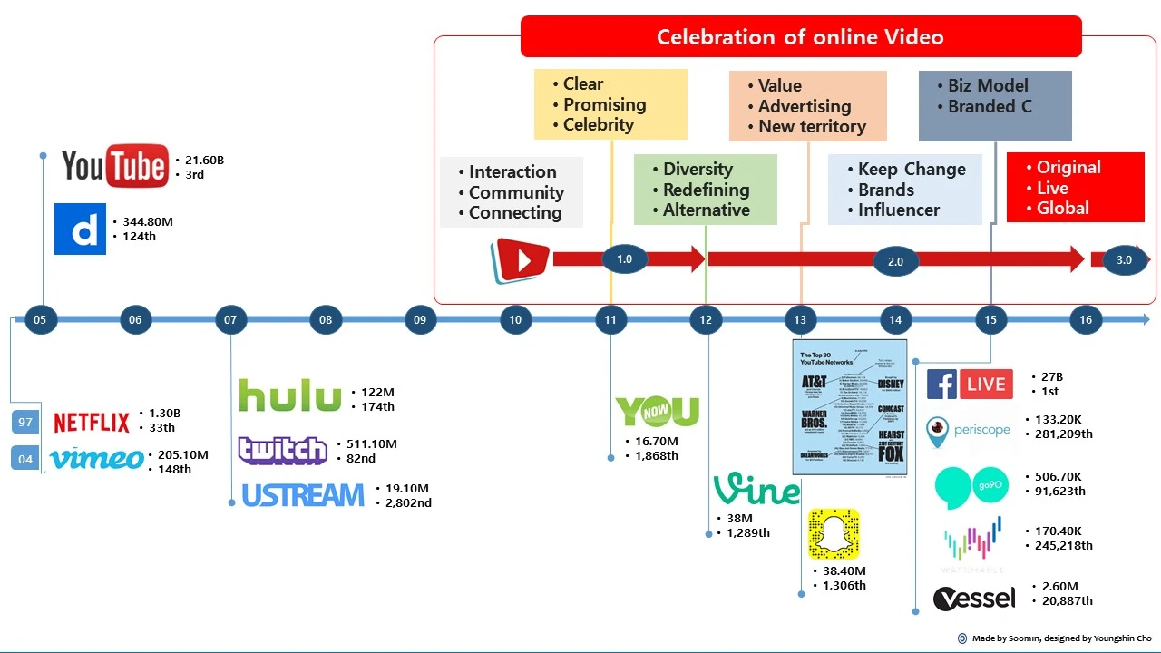 그것이 무엇이든 희소해야만 값이 올라가는 법이고, 값을 올리기 위해서 희소해야 하죠. 그 희소성은 비용에 기인하기도 하고, 장소에 기인하기도 하고 여러 요인에 기인합니다. 그런데 2010년부터 MCN이라고 하는 UCC나 UGC를 공장화하고 산업화한 사업자가 등장합니다. 돈에 신경을 쓰지 않아도 되었던 개인이 아니라 수익에 신경을 써야 하는 기업은 콘텐츠의 가치를 높이는 작업들을 하죠. 그래서 이른바 사람들이 쫓아가면서 보게 되는 콘텐츠들이 하나둘씩 늘어납니다.