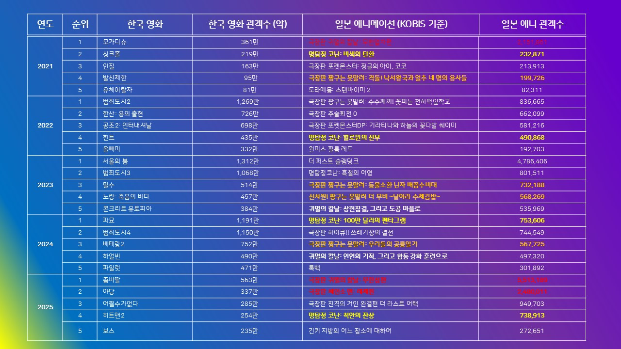 2021년부터 2025년의 성적도 보자. 한국 극장은 팬데믹 이후에 다시 천만 관객 동원 작품이 생기긴 했지만, 5위권 영화의 관람객 수가 4백만 미만으로 줄어들었다. (팬데믹 이전에는 5위권 영화면 대략 7백만 관객 동원).