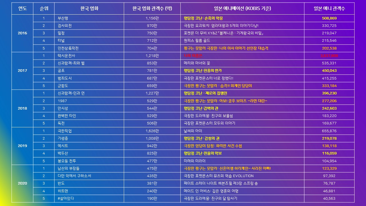 그러나 몇 가지 박스 오피스 자료를 뒤져보면 몇 가지 신기한 것들이 나오긴 한다. 우선 2016년부터 2020년까지 국내 박스 오피스에서 한국 영화 TOP 5와 일본 애니메이션 TOP 5를 보자. 한국 영화의 경우 2020년에 팬데믹의 영향을 받으면서 천만 영화가 사라졌다. 일본 애니는 <나의 이름은>이 360만 관람객을 동원한 것을 제외하고, 명탐정 코난이 대략 3~40만의 고정 관람객을, <짱구는 못 말려>가 2~30만 고정 관람객을 확보하고 있다는 것을 알 수 있다. 이 괸점에서 보면 <나의 이름은>이 예외다.
