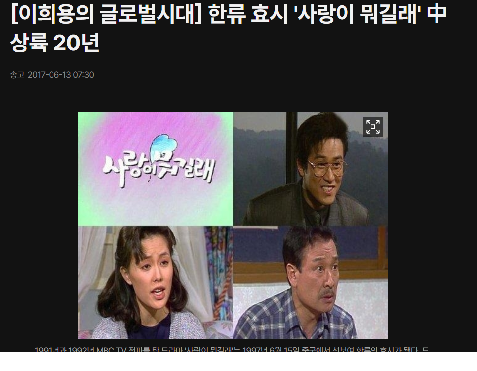 돌이켜 보면 ‘기가 막힌다'라고 할 수밖에 없는 타이밍이었다. 1991년 제작되어 국내에서 인기를 끌었던 <사랑이 뭐길래>가 1997년 중국 CCTV에서 방영되었다. 시청률은 무려 4.2%다. 4.2%가 뭐가 그리 대단하냐고 하겠지만, 당시 12억 인구의 중국 시장에서 4.2%는 1억 5천만 명 이상이 시청했다는 것을 의미한다. 대한민국 전체 인구의 3배가 넘는 수치였다. CCTV의 보수적인 편성 속에서 외국 드라마가 동 시간대 1, 2위를 기록한 이 '사건'을 설명하기 위해, '왜 중국인들이 이 한국 드라마에 열광하는가?’라는 분석 기사가 쏟아졌다. '한류(韓流)'라는 단어가 등장했다.