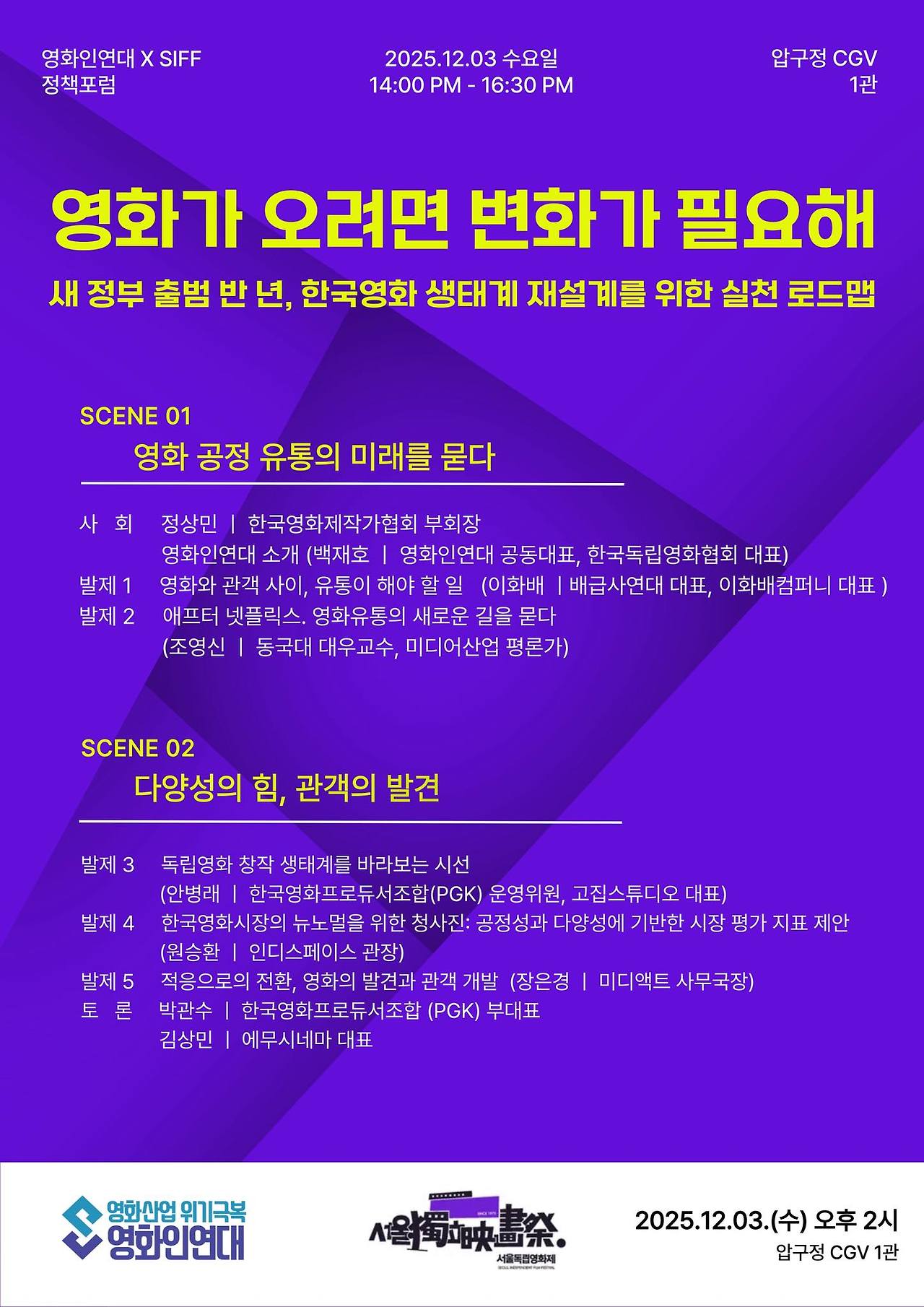 그래서 이야기를 했다. 지금 영화는 영화의 경쟁력을 높이는 것부터 시작해야 한다고. 지난 시기 그렇게 떠들었으나, 여태껏 해결하지 못한 불공정이니 하는 것들을 해소하는 것도 중요하겠지만, 그걸 해소하더라도 우리의 2억 명 시장이 돌아오지는 않는다고. 그러니 무엇보다도 글로벌이란 목표 의식을 가지고, 글로벌로 가기 위해서 우리가 무엇을 해야 하고, 정부에게 무엇을 도와달라고 할 지를 고민하고 이야기해야 한다고.