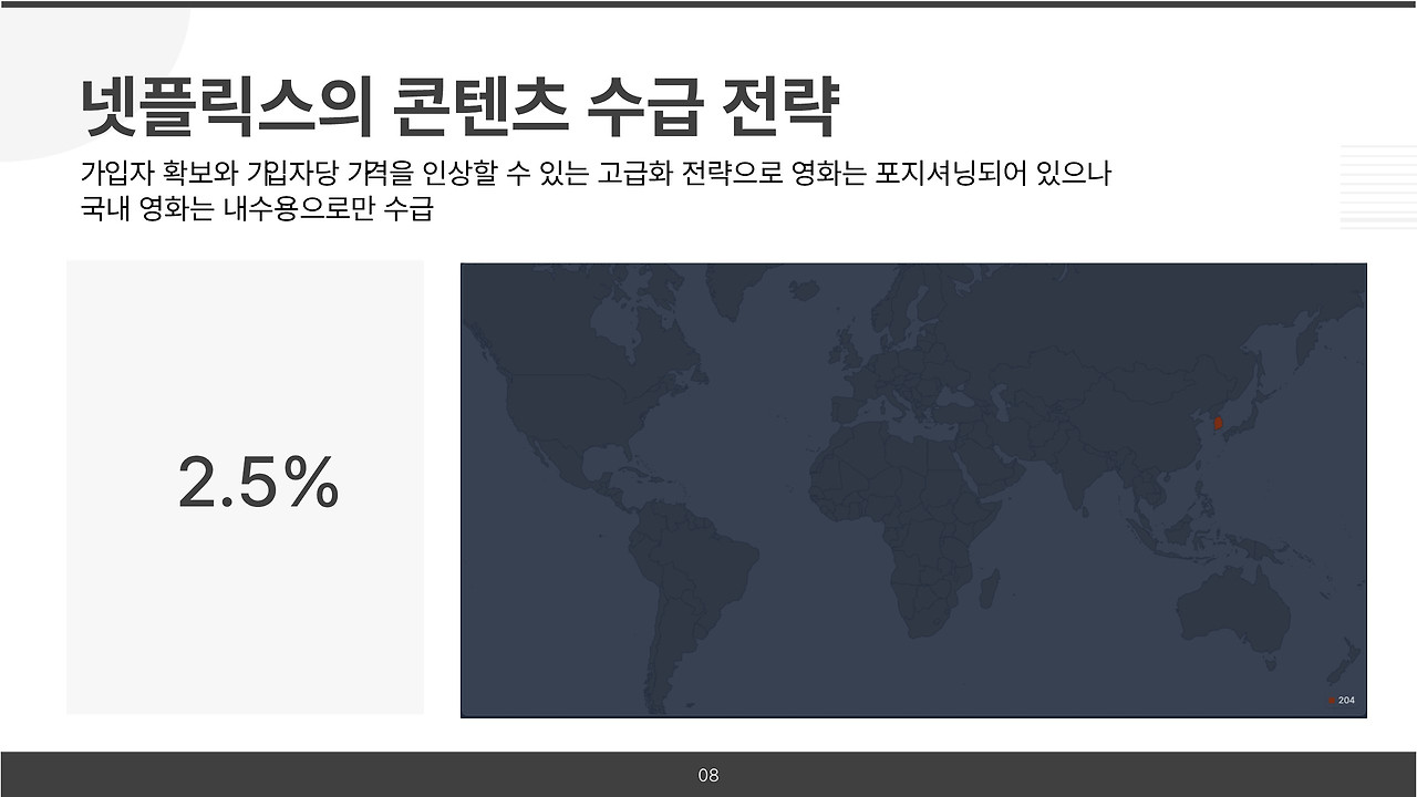 넷플릭스에서 볼 수 있는 2016년 이후 극장 개봉 영화 중에 20개국 이상 자막이 제공되는 영화의 비율이다. 달리 이야기하면 97.5%의 영화가 한국 자막 (일부 영어자막, 일부 아시안) 중심이라는 이야기고, 넷플릭스는 한국 영화를 내수용으로 취급하지 글로벌 용으로 취급하지 않는다는 이야기다. 물론 이 비율이 아주 정확한 것은 아니다. 이미 글로벌 판권을 팔았거나 했을 경우에는 넷플릭스가 원했다고 하더라도 내수용으로밖에 제공할 수밖에 없었을 테니 말이다. 그럼에도 불구하고 내수용의 비율이 압도적으로 높았다는 것을 부인하긴 힘들다.